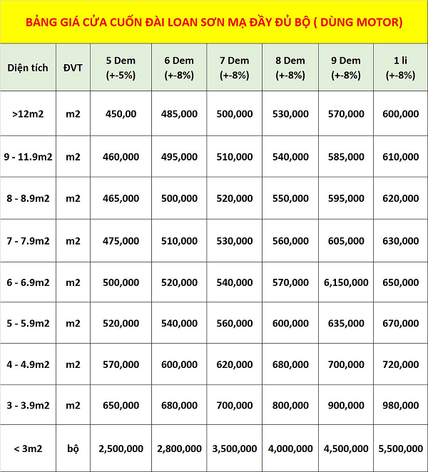 - Giá trên đã bao gồm thân cửa ray dẫn hướng 5cm hoặc 7cm , trục cuốn trợ lực